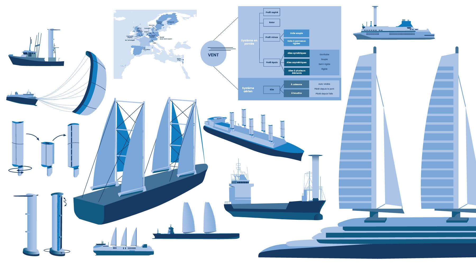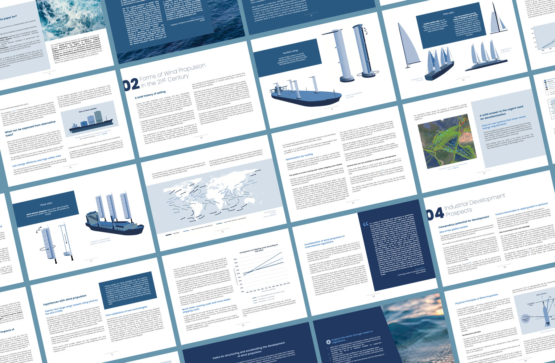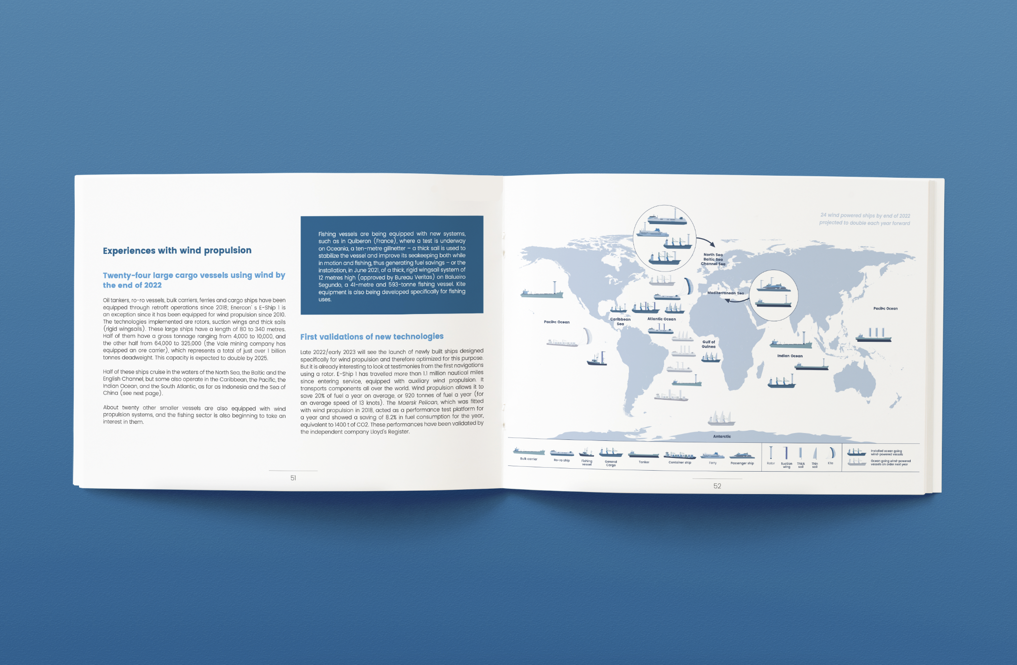 Demande : Mise en page d’un livre blanc en français avec sa déclinaison en anglais, sur le sujet de la propulsion par le vent. Réalisation de nombreux graphiques, tableaux et refonte de nombreux visuels pour une mise en cohérence effective avec la charte graphique établie. Design libre de la couverture.